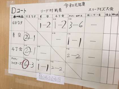 閉会式の様子です。勝敗表と、その横に貼ってあった素敵な言葉です。来年もスリーアイズ大会のようです。みなさまお疲れ様でした。