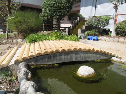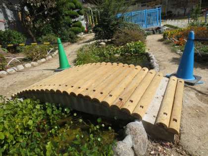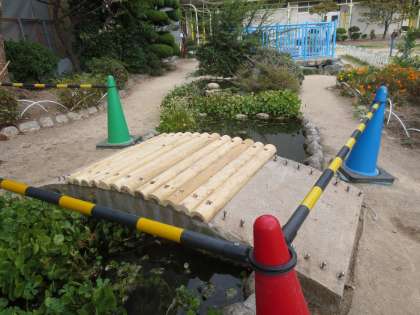 丸太が朽ち、歩きにくく安全ではないので通行禁止にしています。丸太を購入し、管理作業員さんが安全に渡れるように修復しています。