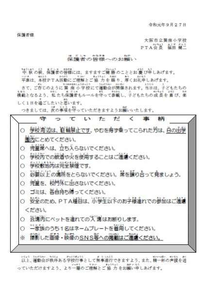 さて、ご存じのように巽南小学校にて運動会が開催されます。