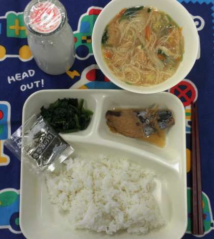 なまりぶしのしょうが煮、みそにゅうめん、ほうれん草のおひたし、ご飯、牛乳