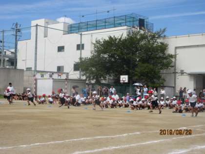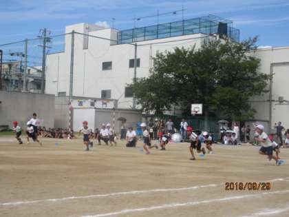 1年生の「よ〜い!ドン」の様子です。小学校に入っての初めてのかけっこです。みんながんばって走りました。