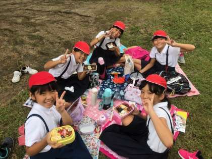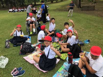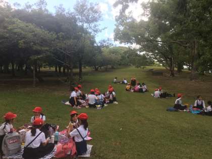お弁当タイムです。広い芝生の上でおいしそうに食べていました。