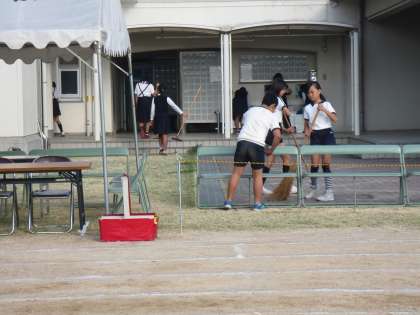 保健・図書委員会の児童は、机や椅子を運んだ後の掃除をしていました。給食委員会は得点板の準備をしていました。