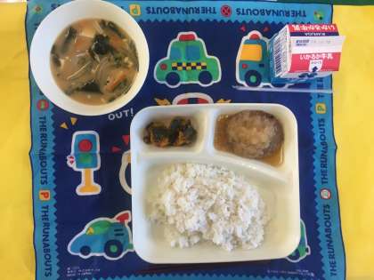和風おろしハンバーグ、みそ汁、かぼちゃのいとこ煮、ご飯、牛乳