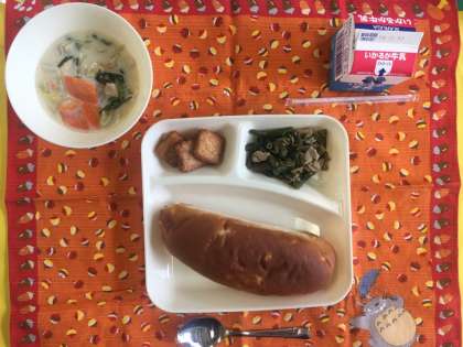 はくさいのクリーム煮、あつあげのごまじょうゆかけ、豚肉とさんどまめのオイスターソースいため、パンプキンパン、牛乳