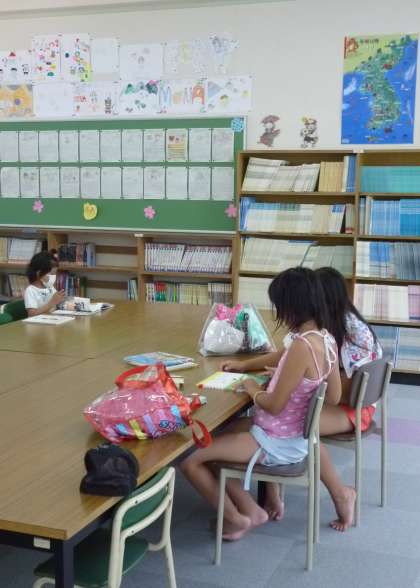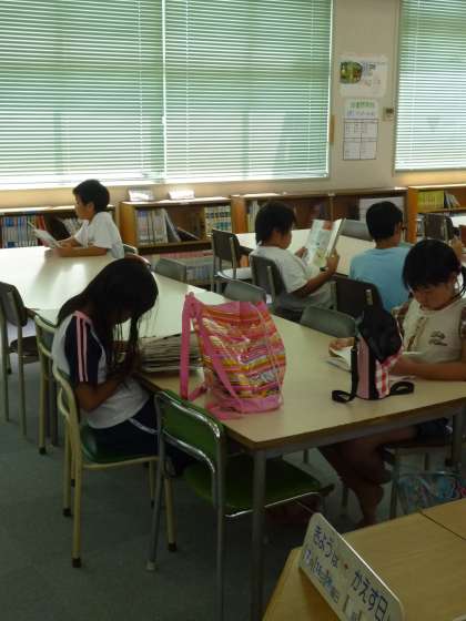 今日は、図書ボランティア「かたつむりクラブ」による図書館開放。熱い日差しの中プール開放に参加していた子が、その火照った身体をエアコンの冷風で冷やしながら、静かに読書していました。