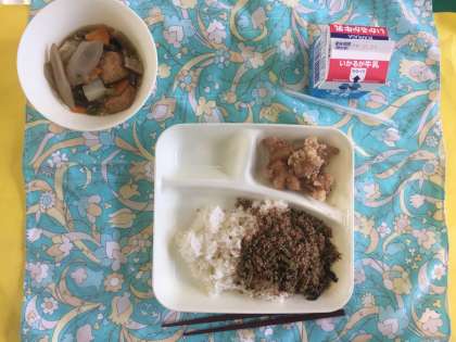 鶏肉のたつたあげ、あつあげと野菜の煮もの、おかかなっ葉、黒糖パン、牛乳
