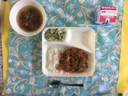 タコライス、もずくと白ねぎのスープ、キャベツときゅうりのサラダ、牛乳