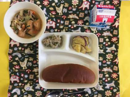 豚肉といかの中華煮、やきさつまいもの甘みつかけ、もやしとピーマンのいためもの、ご飯、牛乳