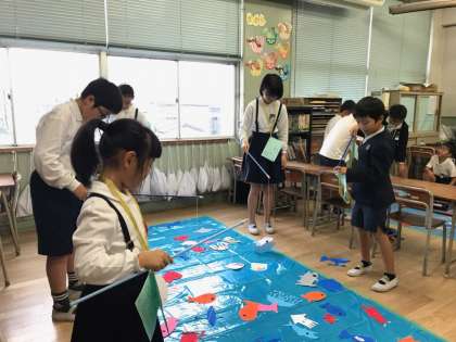 釣り竿でたくさんの魚やタコを釣ります。赤い魚が私のお気に入りです。
