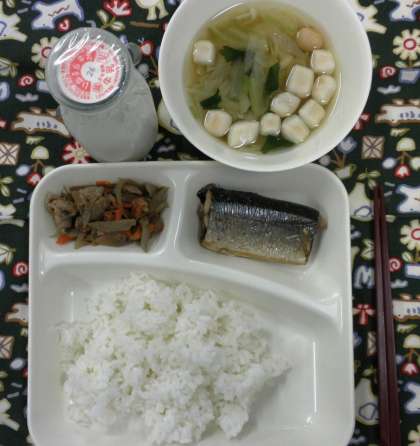 さんまのさんしょう焼き、すまし汁、ごぼうのみそ豆煮、ご飯、牛乳