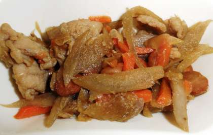 豚肉、いり大豆、ごぼう、にんじんをみそで甘辛く味付けています。