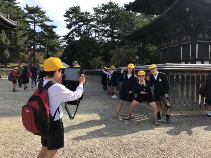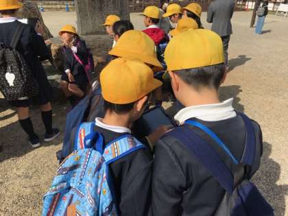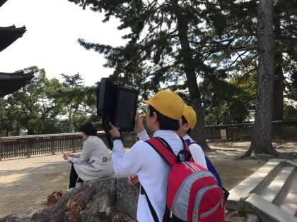 各班でタブレットを持って撮影をしています。