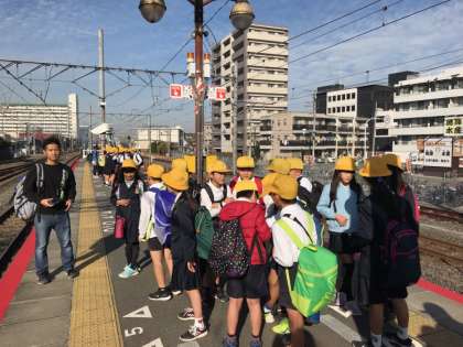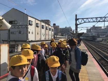 平野駅で電車を待っています。みんな遠足が楽しみな様子です。