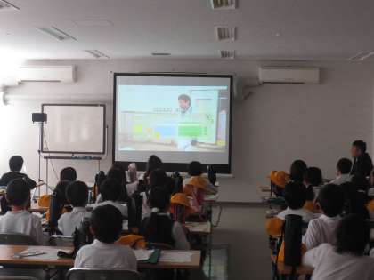 会議室にもどって、映像で市場の仕事を学んでいます。