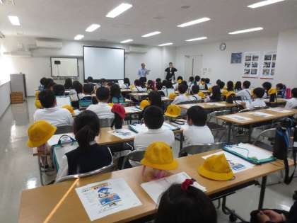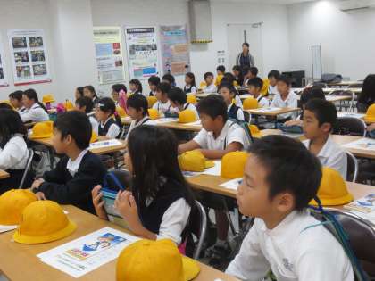 東部市場に到着し会議室で資料をいただき、見学の内容や諸注意をしっかりと聞いています。