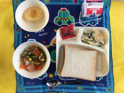 スープ煮、ほうれん草のグラタン、白桃(缶詰)、食パン、いちごジャム、牛乳