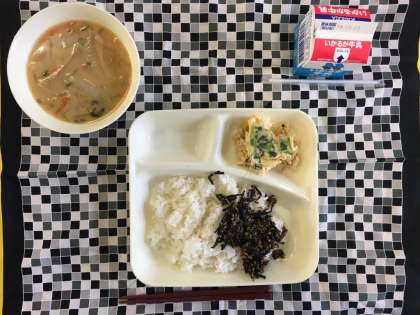 千草焼き、みそ汁、ごまひじき、ごはん、牛乳