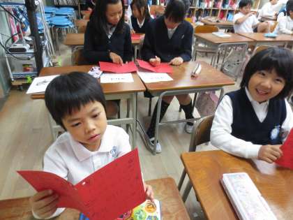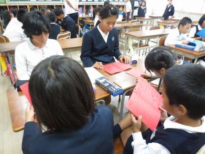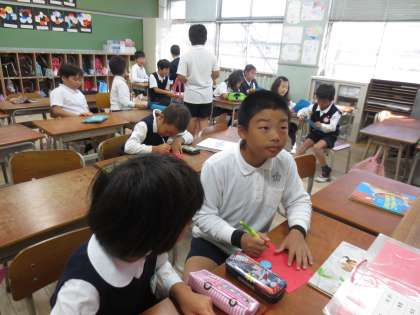 2年2組の教室で、縦割り班活動の話し合いをしています。