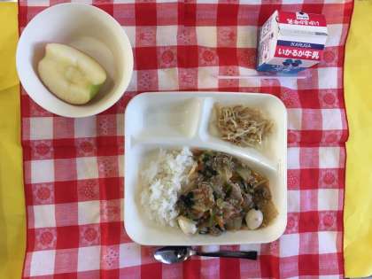 豚肉、うずら卵、たまねぎ、はくさい、にんじん、にらの入ったあんをご飯にかけます。うずら卵の食物アレルギー個別対応献立になっています。