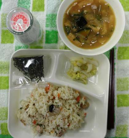かやくご飯、みそ汁、はくさいのゆず風味、牛乳