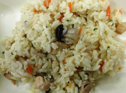 白いご飯に、味付けした具を混ぜています。きざみのりをかけて食べます。
