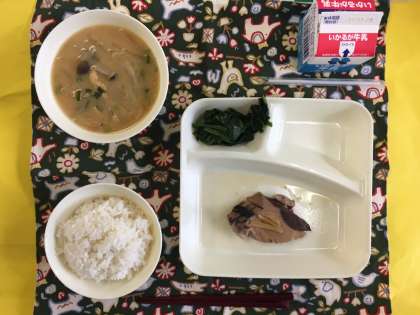 なまりぶしのしょうが煮、みそ汁、ほうれん草のおひたし、ご飯、牛乳
