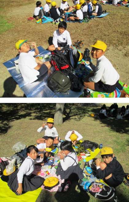 秋晴れの下で、楽しくお弁当を食べました。