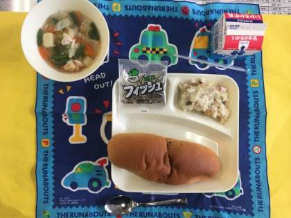 鶏肉とじゃがいものスープ煮、きのこのドリア、ミニフィッシュ、黒糖パン、牛乳