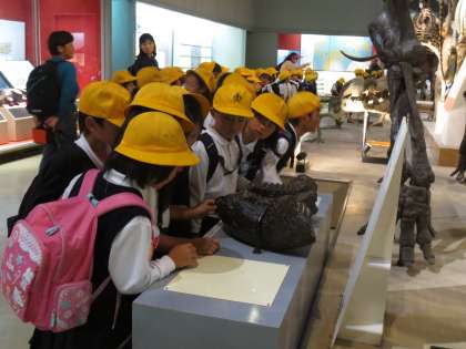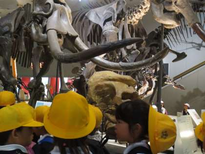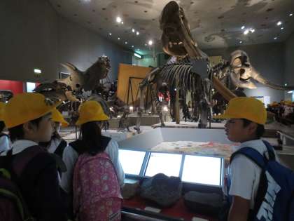 約6,600万年前の大きな恐竜の化石に、子どもたちは少しこわがっていました。