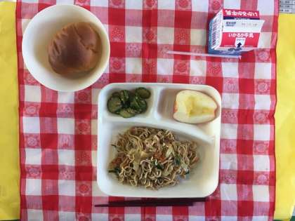 オイスターソース焼きそば、きゅうりの中華あえ、りんご、黒糖パン(小)、牛乳