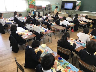 1年生が、給食を食べながら、テレビに見入って