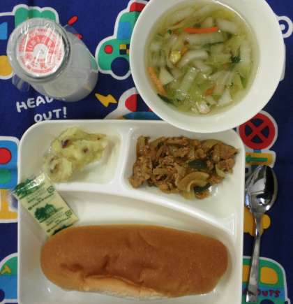 豚肉と野菜のケチャップソテー、はくさいのスープ、スイートポテト、コッペパン、マーガリン、牛乳