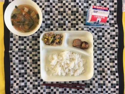 あげシューマイ、とうふのスープ、ツナとチンゲンサイのいためもの、ご飯、牛乳