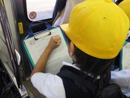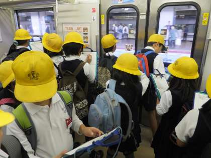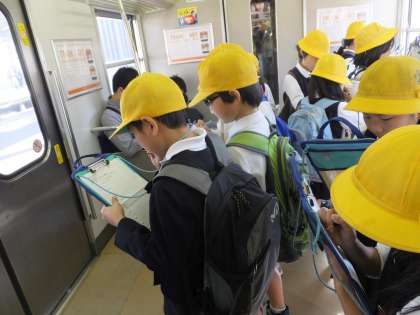 昨日の遠足の様子です。平野駅から電車に乗りました。車中のマナーを守り静かに乗っていました。全員が立ちながら乗車し、今日の学習する内容をたしかめていました。