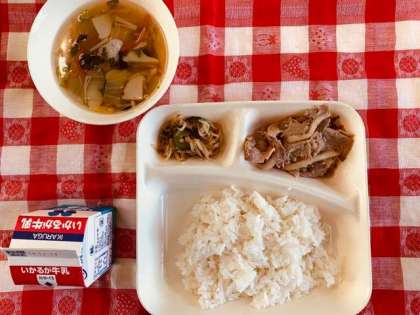 焼き肉、五目汁、きゅうりともやしのおひたし、