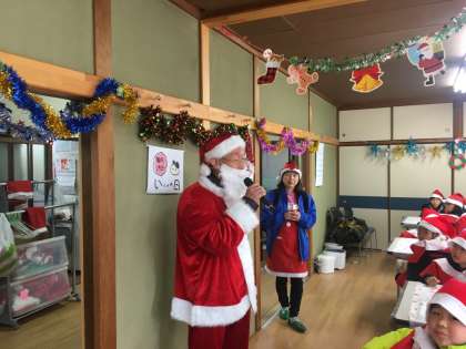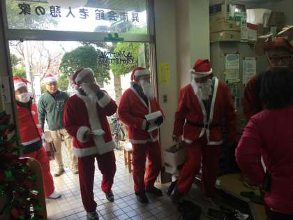 まちづくり協議会会長の川端サンタのあいさつの後は、早速、一人暮らし高齢者のお家に出発です。トナカイも参加します。