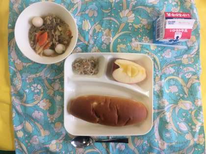 八宝菜、もやしのごま酢あえ、りんご、おさつパン、牛乳