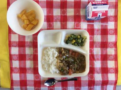 冬野菜のカレーライス、ブロッコリーとコーンのサラダ、黄桃(カット缶)、牛乳