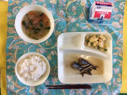 いわしのしょうが煮、うすくず汁、高野どうふの卵とじ、ご飯、牛乳