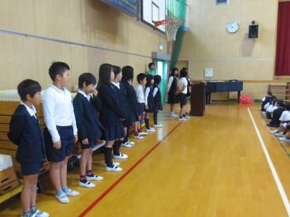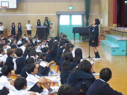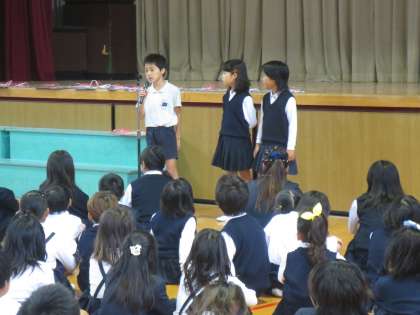開会式は児童会の子どもたちが中心になって進めていました。児童会代表のあいさつや「めあて」「注意」をしっかりと話してくれました。