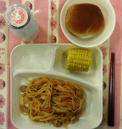 チキントマトスパゲッティ、蒸しとうもろこし、黒糖パン(小)、牛乳