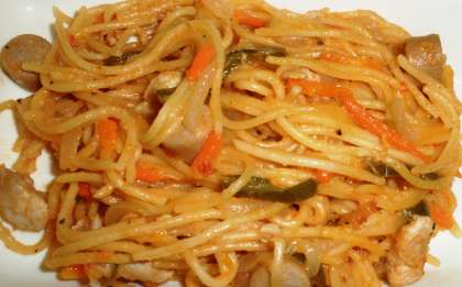 鶏肉、ウインナーの入った、バジル風味のトマトスパゲッティです。