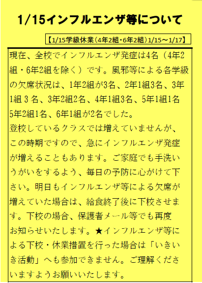 【学級休業1/15〜1/17(4年2組・6年2組)】