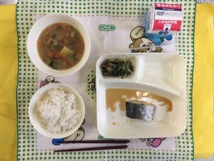 さごしのしょうゆだれかけ、みそ汁、みずなの煮びたし、ご飯、牛乳