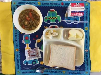 豚肉と野菜のカレー煮、カリフラワーとコーンのサラダ、りんご、食パン、いちごジャム、牛乳