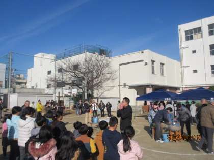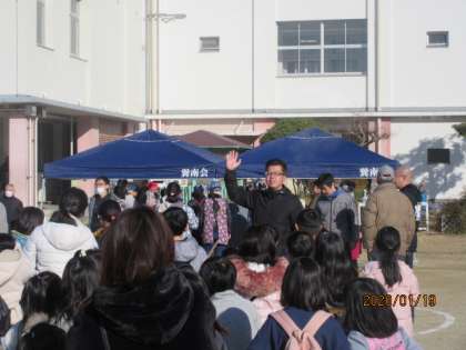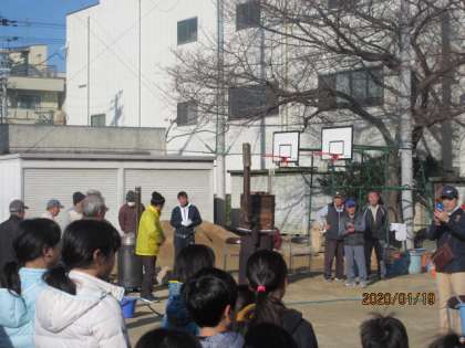 開会式が始まりました。PTA会長の福田さんのあいさつです。町会、地域の方々、PTAの方々にお世話になるので、「よろしくお願いします。」とあいさつをしています。