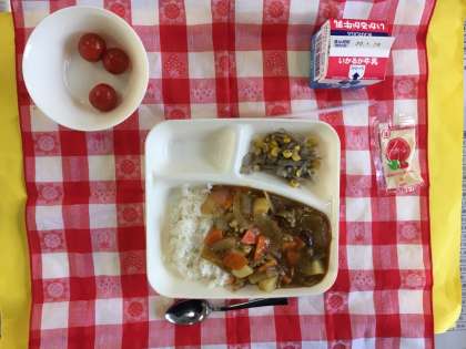 豚肉と金時豆のカレーライス、ごぼうサラダ、パインアップル(缶)、牛乳