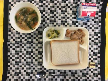 鶏肉のオイスターソース焼き、えびととうふのスープ、チンゲンサイのピリ辛和え、食パン、バター、牛乳
