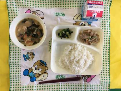 豚肉のごまだれ焼き、みそ汁、きくなとはくさいのおひたし、ご飯、牛乳